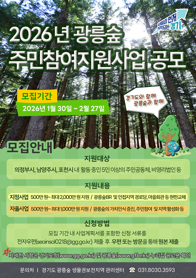 경기도가 광릉숲 생물권보전지역 활성화를 위해 2026년 광릉숲 주민참여지원사업 참여자를 모집한다.