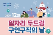 5개 업체 참여해 18명 채용 12월 9일 오후 3~4시 수원시여성문화공간 휴에서 수원특례시(시장 이재준)는 12월 9일 오후 3시부터 4시까지 수원시여성문화공간 휴(권선구 동수원로 224번길 10)에서 ‘12월 일자리 두드림 구인·구직의 날’ 채용 행사를 연다. ▲ 행사 관련 포스터 주식회사 그린씨앤씨텍, 케이티텔레캅주식회사, 주식회사티에프이, 휴먼스토리에프에스㈜, 이트너스㈜ 등 5개 업체가 참여해 전기·전자 부품·제품 조립원, 일반제품 영업원, 기계·무인 경비원, 단체급식 보조원, 일반 택배원 등을 채용한다. 채용 인원은 총 18명이다. 현장에서 구인 기업과 구직자가 1대1 채용 면접을 한다. 수원시는 취업 정보를 제공하고, 이력서·면접 클리닉을 운영하는 등 구직자들을 지원한다. 일자리를 구하는 수원시민은 누구나 참여할 수 있다. 수원일자리센터가 주관하는 ‘일자리 두드림’은 취업에 어려움을 겪는 구직자와 인재 채용을 원하는 기업을 연결해 주는 소규모 채용 행사다. 수원일자리센터는 일자리 두드림 외에도 ‘상설면접’, ‘동행면접’ 등 소규모 채용 행사로 현장 면접과 채용 상담을 동시에 진행하고 있다. 구직자의 부담을 줄이고, 기업이 적합한 인재를 신속하게 채