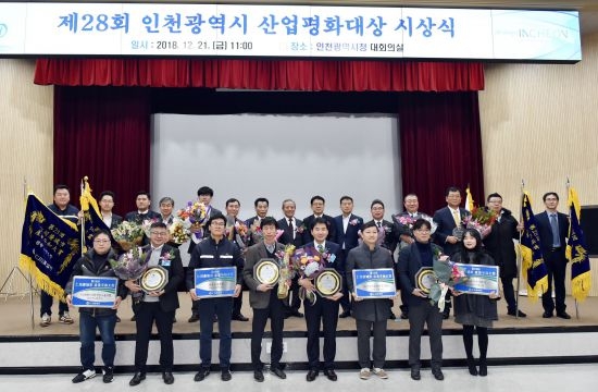 인천시(시장 박남춘)는 12월 21일 시청 대회의실에서 제28회 인천광역시 산업평화대상 시상식을 개최하고, 선광 노동조합(정승섭 위원장)과 디와이㈜ 조병호 대표이사 등 모두 12명(단체, 개인)에게 상패와 깃발, 현판을 수여했다.