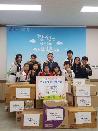용인시 처인구 역삼동은 역북동 명지대동아태권도장 원생들이 어려운 이웃을 위해 사용해 달라며 라면 1352개를 기탁했다고 3일 밝혔다.