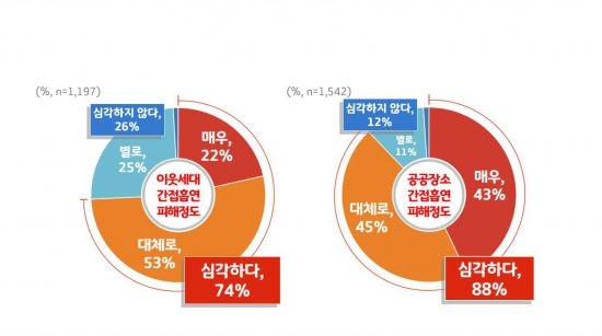 경기도민 10명 중 8명 가량이 이웃세대의 간접흡연으로 피해를 받았으며, 이 중 74%는 ‘심각’하게 느끼고 있는 것으로 조사됐다.