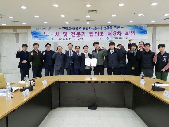 인천시(시장 박남춘)는 지난 11일 인천시 간접고용(용역)근로자들의 정규직 전환을 위한 '노‧사 및 전문가 협의회'를 개최하여 청소 등 4개 직종 용역근로자 161명을 정규직으로 전환하기로 결정하였다고 발표하였다. 이로써 시에 간접 고용되어 종사하는 용역근로자는 올해 상반기 중에 전원 직접고용 형태로 정규직으로 전환 채용된다.