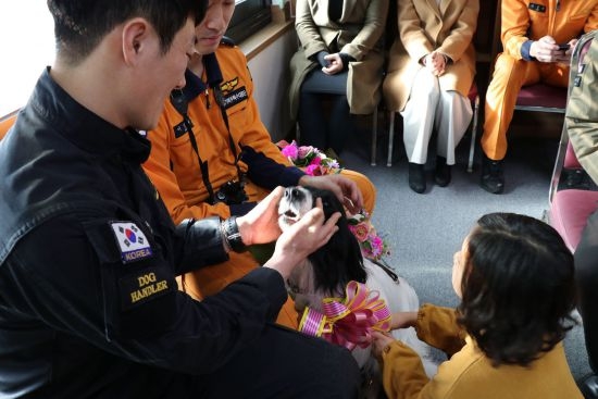 이날 은퇴식은 수안의 재난현장 활약상을 소개한 영상을 시작으로 담당 핸들러의 꽃다발 증정식, 분양대상자 전달, 기념촬영 순으로 진행됐다.