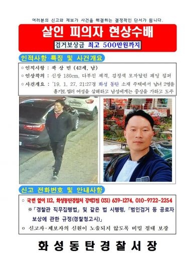 화성동탄경찰서(서장 김병록)는 지난 2019년 1월 27일 경기도 화성시 동탄 소재 주택에서 남녀 2명을 흉기로 찔러 여성을 살해하고, 남성에게는 중상을 가한 혐의로 피의자 곽상민(42세, 남)을 공개수배 했다.