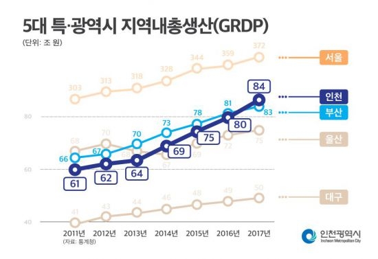 통계청의 ‘2017년 지역소득 보고서’에 따르면 인천의 GRDP는 약 84조590억원으로 7개 특·광역시 중 서울(372조1,100억원) 다음으로 높다. 3위는 부산(83조2,990억원)이 그 뒤는 울산, 대구가 이었다.