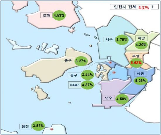 부평구 5.62%, 남동구 5.26%, 강화군 4.53% 순