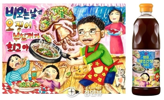 2023 맛있는 추억 간장은 박지민(10) 어린이의 ‘비 오는 날엔 오징어 부침개가 최고야!’ 그림으로 꾸며졌다. 창밖엔 비가 내리고, 프라이팬을 들고 오징어 부침개를 부치며 땀 흘리는 아빠와 부침개를 맛있게 먹는 아이들, 그 모습을 흐뭇하게 바라보는 엄마의 미소가 따뜻하고 유쾌하게 표현됐다.