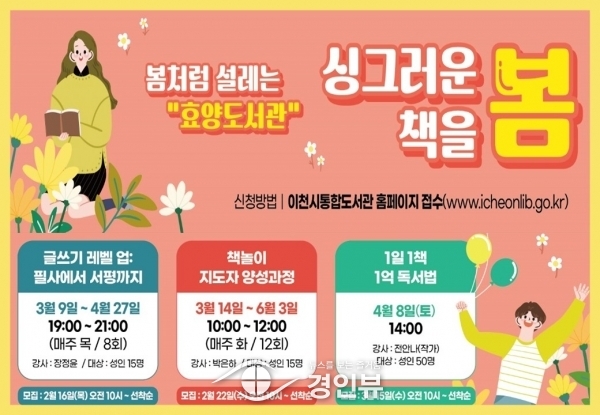 (경인뷰) 이천시 효양도서관에서는 바람 따라 꽃향기가 전해지는 새봄을 맞아 봄맞이 독서프로그램 ‘싱그러운 봄, 책을 봄’을 운영한다.