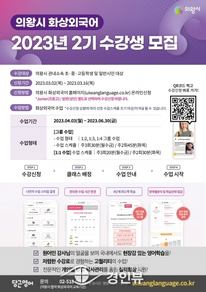 김성제 의왕시장은 “의왕시 화상외국어 학습은 시민들에게 꾸준히 사랑받는 우수한 교육 사업”이라며 “앞으로도 교육 환경 변화에 발 빠르게 대응해 수준 높은 교육 서비스를 제공하기 위해 노력하겠다”고 말했다.