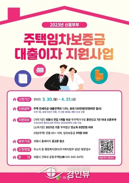 의왕시는 ‘신혼부부 주택임차보증금 대출이자 지원사업’ 대상자를 3월 20일부터 4월 21일까지 모집한다고 밝혔다.