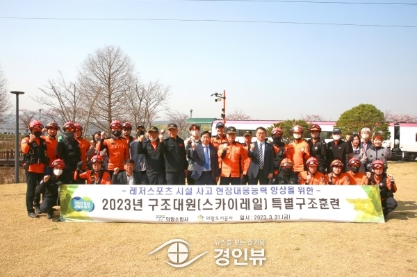 (경인뷰) 의왕도시공사는 3월 31일 오전 10시부터 의왕왕송호수캠핑장 내 스카이레일 하강시설에서 안전사고 대비 인명 구조훈련을 실시했다.