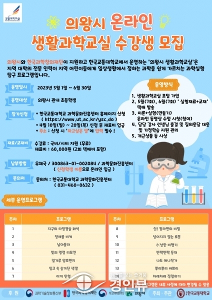 의왕시와 한국과학창의재단이 지원하고 한국교통대학교에서 운영하는 ‘의왕시 생활과학교실’은 지역대학의 전문인력이 지역의 어린이들에게 일상생활에서 접할 수 있는 과학을 쉽고 재미있게 알려주는 과학실험탐구 프로그램이다.