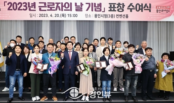 (경인뷰) 이상일 용인특례시장이 지난 20일 시청 컨벤션홀에서 산업현장에서 소임을 다하며 안전한 노동환경 조성에 힘쓴 모범 근로자 20명에게 표창장을 수여하고 격려했다.