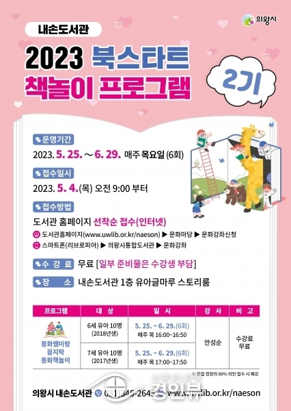 (경인뷰) 의왕시 내손도서관은 2023년 북스타트 책놀이 프로그램 2기 ‘동화쌤이랑 꼼지락 동화책놀이’참가자를 5월 4일 선착순 모집한다.