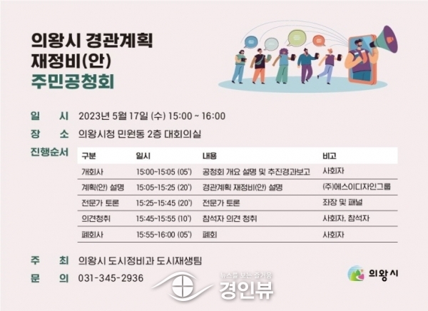 (경인뷰) 의왕시는 오는 17일 의왕시청 대회의실에서 ‘의왕시 경관계획 재정비’에 대한 주민공청회를 개최한다.