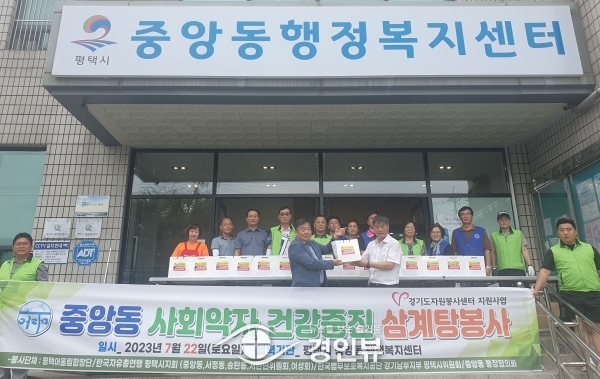 이날 삼계탕 봉사는 경기도 자원봉사센터 공모사업에 선정되어 진행되는 사업으로 평택어울림합창단 단원 20명과 한국자유총연맹 평택시지회 북부면동위원회 회원 20여명, 한국법무보호복지공단 경기남부지부 평택시위원회 회원 15명이 함께 참여해, 전통 보양식인 삼계탕을 정성껏 직접 끓여 곁들임 반찬과 함께 포장해 중앙동 행정복지센터에 전달했으며 중앙동 통장협의회 45곳 통장들의 도움으로 지역 내 홀몸노인과 취약계층 가정으로 직접 전달했다.