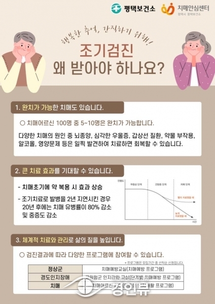 (경인뷰) 평택보건소 치매안심센터는 치매 및 고위험 어르신을 미리 발견해 적절한 치료와 관리를 받을 수 있도록 8월부터 10월까지 만 60세 이상 시민을 대상으로 찾아가는 치매 조기 검진을 한다고 밝혔다.