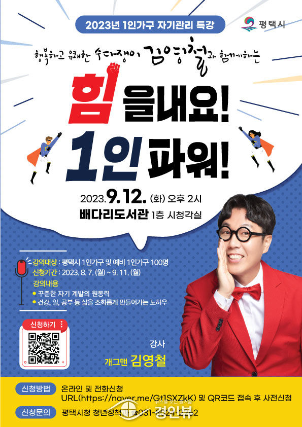 (경인뷰) 평택시는 오는 9월 12일 오후 2시에 배다리도서관 1층 시청각실에서 1인 가구를 위한 자기관리 특강을 개최한다고 밝혔다.