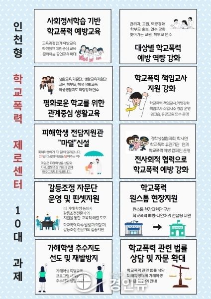인천시교육청은 인천형 학교폭력 제로센터 시범 모델을 구축하기 위해 사회정서학습 기반 학교폭력 예방교육 대상별 학교폭력 예방 역량 강화 평화로운 학교를 위한 관계중심 생활교육 학교폭력 책임교사 지원 강화 전 사회적 협력으로 학교폭력 예방 강화 피해학생 전담지원관 신설 갈등조정 자문단 운영 및 핀셋지원 학교폭력 원스톱 현장지원 가해학생 추수지도 선도 및 재발방지 학교폭력 관련 법률 상담 및 자문 확대 등 10대 과제를 제시했다.