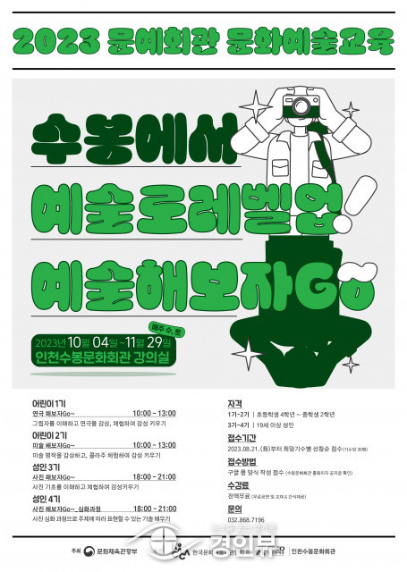 ‘수봉에서 예술로 레벨업! 예술해보자 go~’는 어린이 대상 2개 영역(△1기 : 연극(10월) △2기 : 미술(11월))과 성인 대상 1개 영역(3기 : 사진(10월), 4기 : 사진 심화과정(11월))로 진행되며 다양한 작품 관람 방법과 작품의 이해를 돕기 위한 체험을 결합한 감상형 학습으로 구성했다. 교육 뿐만 아니라 인천수봉문화회관의 자원을 활용, 직접 공연장과 전시관을 방문해 작품을 감상하는 체험활동도 병행할 예정이다.