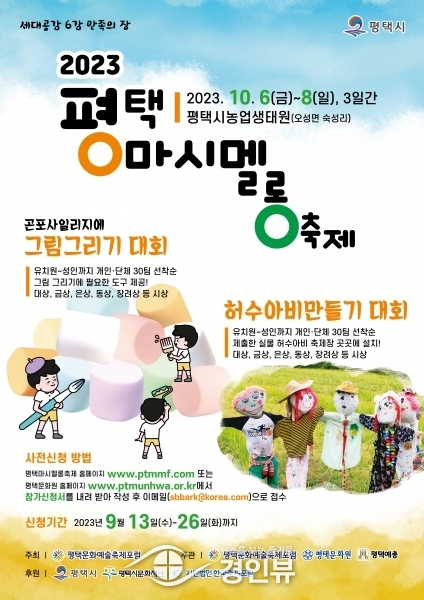 (경인뷰) 평택문화예술축제포럼이 오는 10월 6일부터 8일까지 평택시농업생태원에서 개최하는 ‘2023 평택마시멜롱축제’에서 시민참여형 프로그램으로 ‘마시멜롱 그림그리기대회’와 ‘허수아비 만들기 대회’를 진행하고 9월 13일부터 9월 26일까지 사전 신청을 받는다.