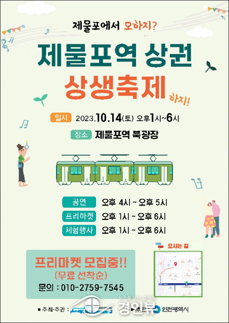 제물포역 도시재생 현장지원센터는 인천광역시 도시재생 지원 사업의 일환으로 제물포역 일원 도시재생사업의 핵심 목표 중 하나인 제물포역 일대 상권활성화를 위해 2023년 제물포역상인회가 정식 등록되고 첫 행사인 ‘제물포역 상권 상생축제’를 개최하게 돼 기쁘며, 그동안 상인회 설립과 축제 개최에 수고하신 상인회 임원들과 회원들에게 감사하다고 밝혔다.