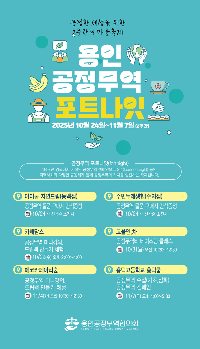 용인특례시(시장 이상일)와 용인공정무역협의회는 10월 24일부터 11월 7일까지 2주간 용인시 공정무역 포트나잇 축제를 개최한다.