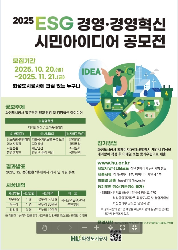 화성도시공사(사장 한병홍, 이하 HU공사)는 오는 10월 20일부터 11월 21일까지 ‘2025년 ESG경영·경영혁신 시민 아이디어 공모전’을 개최한다고 밝혔다.