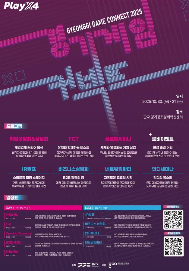 사전등록 및 프로그램 일정은 누리집(g-gameconnect.oopy.io)과 이벤터스 플랫폼(event-us.kr/gca/event/112650)을 통해 확인할 수 있다.