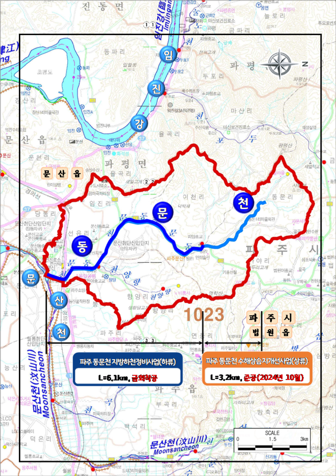 정비사업은 파주시 문산읍 선유리에서 법원읍 동문리에 이르는 동문천 일원 총 연장 6.1km 구간의 하천을 정비하는 것으로 ▲축제공(제방 쌓기) 6.1km ▲보축(제방 보수·보강)2.4km ▲교량 5개소 설치 등이 포함된다.