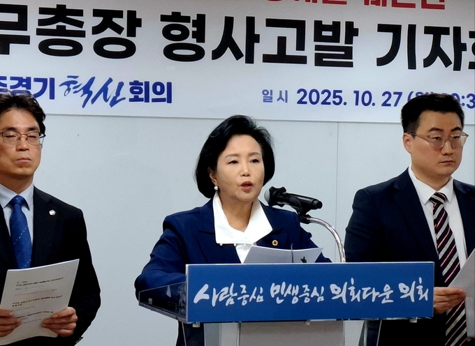 ▲ 경기도의회 정윤경 의원이 이민기 개혁신당 사무총장을 형사고발하는 기자회견을 진행하고 있는 모습