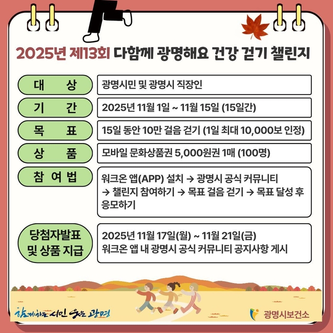 이번 챌린지는 오는 11월 1일부터 15일까지 15일간 열리며, 광명시민과 광명시에 소재한 직장인이면 누구나 참여할 수 있다. 참가자는 기간 동안 총 10만 보를 걸으면 되며, 1일 최대 1만 보까지만 인정된다.