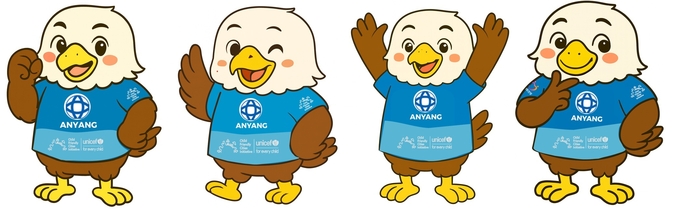 ‘또미’는 안양시 시조(市鳥)인 독수리를 친근하게 의인화한 캐릭터로 유니세프의 아동친화 철학을 담은 파란색 티셔츠를 입고 있는 ‘밝고 정의로운 어린 독수리 친구’이다.
