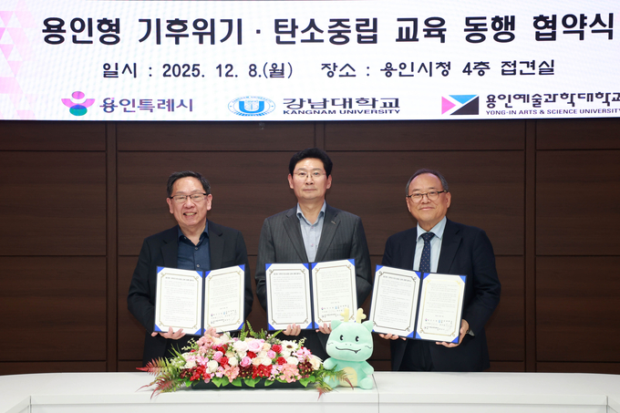 용인특례시(시장 이상일)는 8일 시청 접견실에서 강남대학교, 용인예술과학대학교와 ‘용인형 기후위기·탄소중립 교육 동행 협약’을 체결했다.
