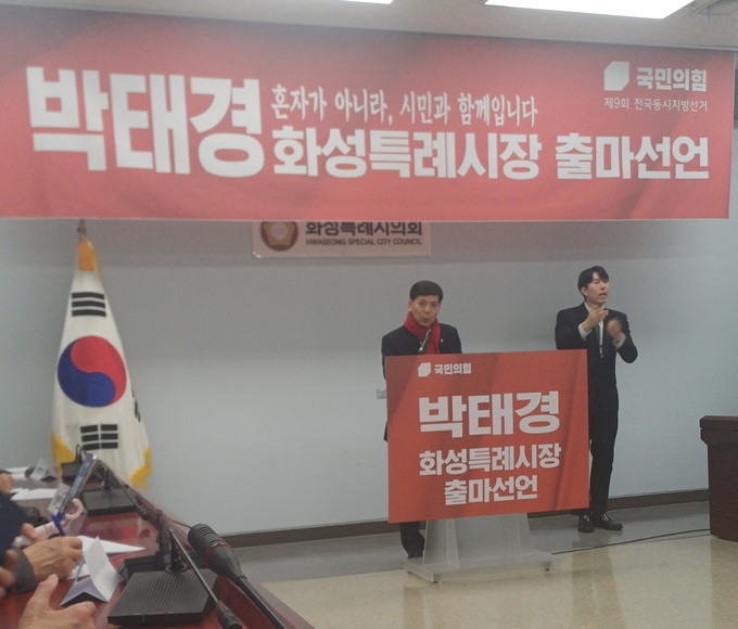 박태경 전 화성시 일자리경제국장이 지난 2월 11일, 오후 11시 30분, 화성시의회 대회실에서 기자회견을 열고 “기다려도 오지 않는 버스, 불러도 대답 없는 행정을 바꿔보겠다”라며 화성시장에 출마했다.