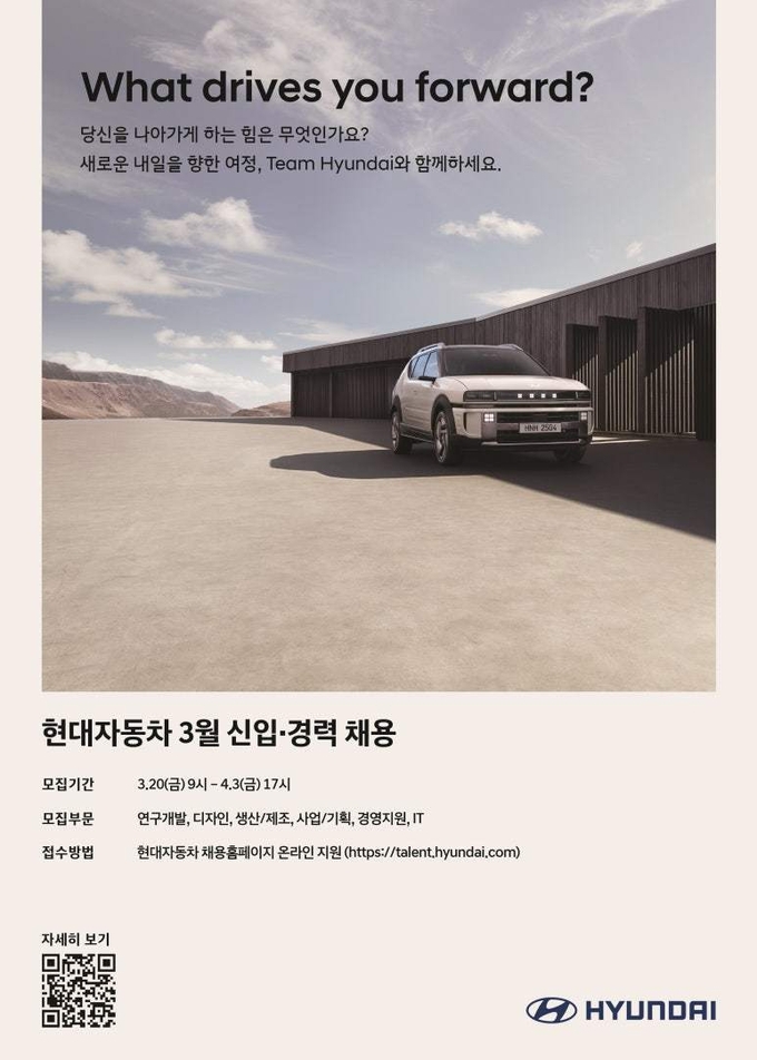 현대차는 미래 경쟁력의 출발점이 될 ‘도전을 두려워하지 않는 인재’와의 만남을 기대한다며, 앞으로도 열정과 성장 잠재력을 보유한 인재를 확보하기 위해 적극적인 채용 활동을 이어갈 것이라고 밝혔다.