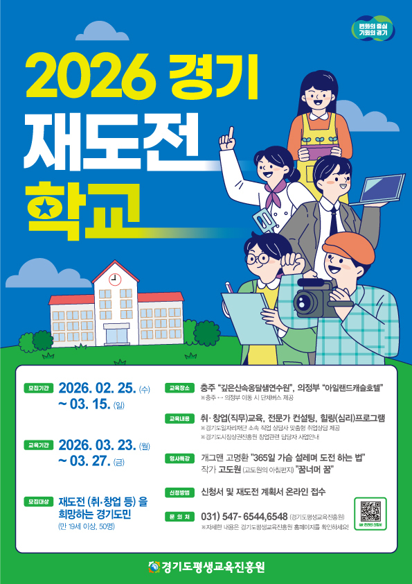 경기도와 경기도평생교육진흥원은 취업이나 창업 실패를 경험한 도민의 재도약을 지원하기 위해 지난달 25일부터 이번 달 15일까지 ‘2026년 경기 재도전학교’ 제1기 참가자 모집을 완료했다.