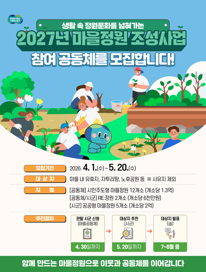 경기도는 마을 내 방치된 유휴 공간을 주민이 직접 정원으로 가꾸는 ‘2027년 마을정원 조성사업’ 대상지를 5월 20일까지 공개 모집한다.
