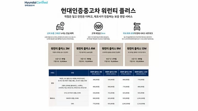 ‘현대인증중고차 워런티 플러스’의 보증 범위는 △일반 부품 △냉난방 부품 △동력 전달 주요 부품 △엔진 주요 부품이다.