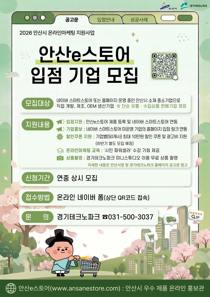 입점 대상은 네이버 스마트스토어 또는 자체 누리집을 운영하는 안산시 소재 중소기업과 소상공인 가운데 직접 개발·제조하거나 주문자상표부착생산(OEM) 방식으로 생산하는 기업이다. 단순 유통·수입 상품 판매 기업은 제외된다.