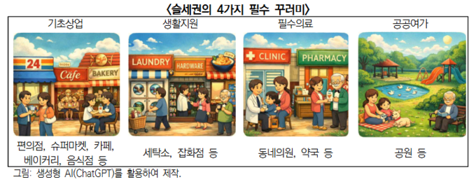 경기연구원은 최근 발표한 보고서를 통해 이른바 ‘슬세권(슬리퍼 생활권)’이라 불리는 보행 생활권의 중요성을 분석하고, 도민들의 삶의 질을 높이기 위한 새로운 도시 조성 방향을 제시했다. 슬세권은 슬리퍼와 같은 편안한 차림으로 카페, 편의점, 병원 등 일상에 필요한 시설을 걸어서 10분(약 500m) 안에 누릴 수 있는 동네를 뜻하는 신조어다.