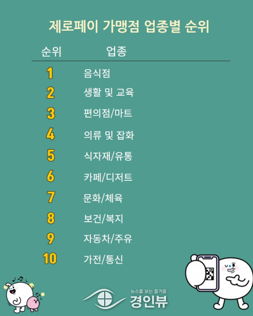 업종별 가맹 현황을 살펴보면 음식점이 29만7000여개로 가장 많았고, 생활 및 교육업이 23만개, 편의점 및 마트가 10만여개로 뒤를 이었다. 제로페이는 편의점부터 동네 마트, 병·의원, 약국, 미용실, 실내 체육센터 등까지 다양한 소상공인 가맹점에서 이용되고 있다.