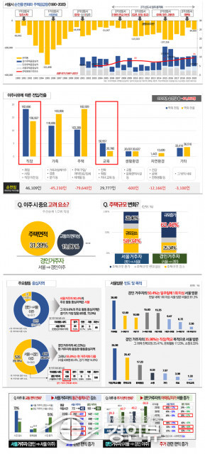 설문조사 결과, 서울에서 경인으로 전출 시 가장 중요한 고려 요소는 주택 면적(31.4%)이었는데, 실제 서울→경기로 이주 시 주택 규모가 증가했다고 응답한 비율은 62.46%로, 경기→서울로 전입 시 주택 규모가 증가했다고 응답(28.46%)한 경우보다 2배 이상 많았다.