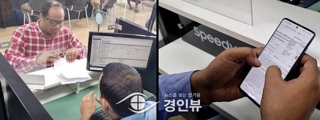 ▲ 왼쪽부터 삼성전자 인도 서비스센터에서 고객이 서비스 내역을 종이문서로 받는 이전 모습과 스마트폰에서 전자문서로 편리하게 확인하는 현재 모습
