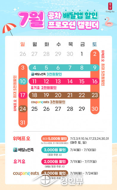 글로벌 티(Tea) 음료 전문 브랜드 공차코리아가 여름 휴가철을 맞아 7월 한 달간 주요 배달 앱에서 다양한 할인 프로모션을 실시한다고 29일 밝혔다.