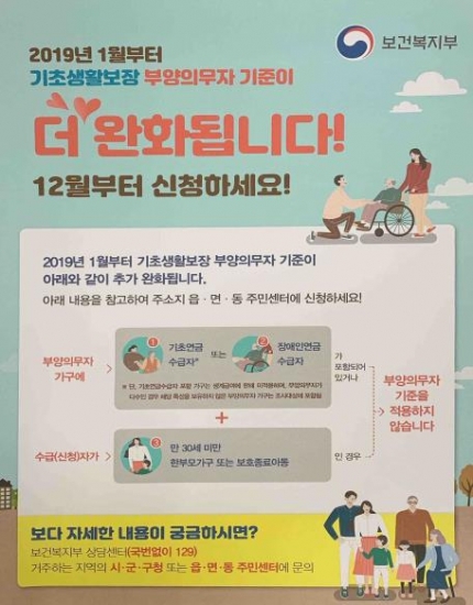 인천시는 국민기초생활보장법에 근거한 보건복지부 부양의무자 기준 개선과 관련하여 2019년부터 기초생활보장 부양의무자 기준이 장애인연금 수급자, 기초연금 수급자가 포함된 가구에 대해 더 완화됨에 따라, 12월 3일부터 주소지 읍‧면‧동 주민센터를 통해 사전신청을 받는다고 밝혔다.