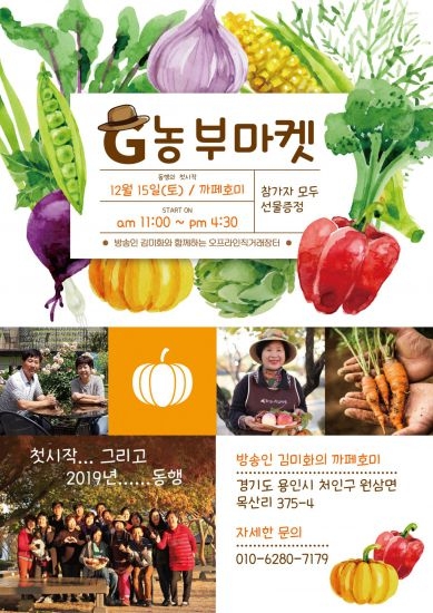 ‘G농부마켓’은 2018년 농기원 정보화교육(e비즈니스, 농산물온라인판로개척)을 수료한 수강생들이 온‧오프라인에서 소통하며 농가들이 생산한 우수 농산물을 한자리에 모아 홍보‧판매하는 장터이다.