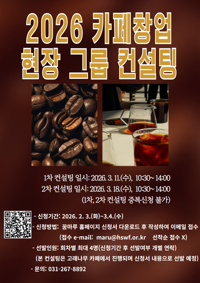 컨설팅은 총 2회에 걸쳐 진행되며, 1차는 2026년 3월 11일(수), 2차는 3월 18일(수) 각각 오전 10시 30분부터 오후 2시까지 경기도 수원시에 위치한 고래나무 카페에서 진행될 예정이다.