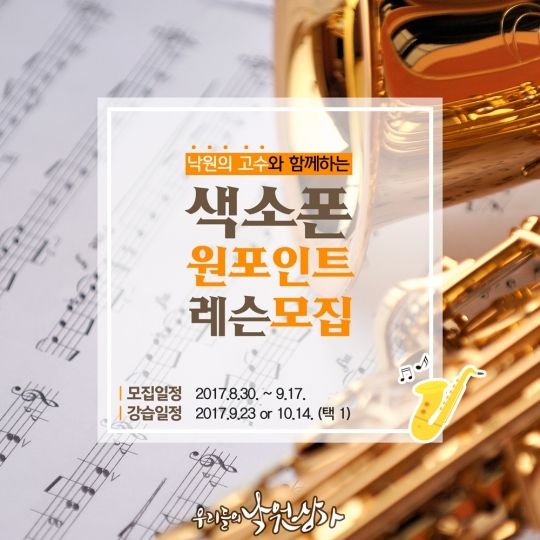 '낙원의 고수-‘색소폰 원포인트 레슨’ 참가 신청은 8월 30일(수)부터 9월 17일(일)까지 우리들의 낙원상가 공식 페이스북(www.facebook.com/nakwonmusic)과 블로그(http://blog.naver.com/enakwon)에서 할 수 있다. 9월 23일(토)과 10월 14일(토)에 참가자 각 15명씩 총 30명을 선정하며, 당첨자는 9월 18일(월)에 공식 SNS를 통해 발표된다. 참가비는 1만원이며, 강습에 참가하는 사람들에게는 악기 습기제거제인 뮤직드라이를 선물로 증정할 예정이다. 보다 자세한 내용은 낙원악기상가 공식 SNS에서 확인할 수 있다.