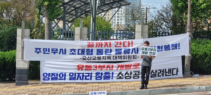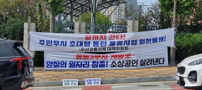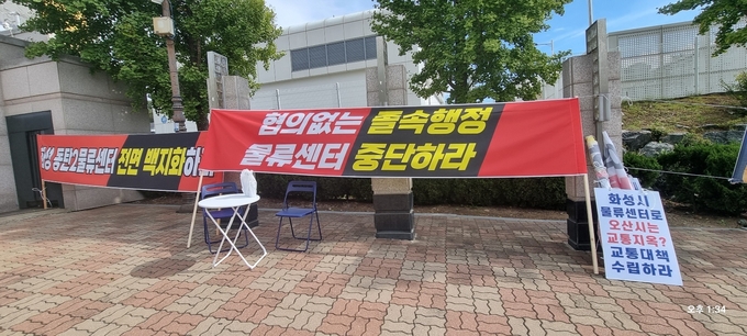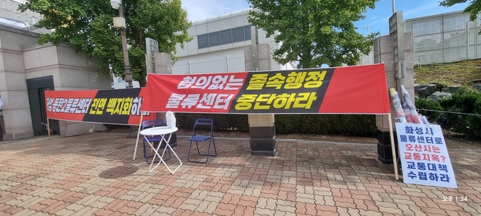 화성 동탄 유통 3부지 물류센터 설립과 관련 반대하는 오산시민들과 찬성하는 화성 시민들의 화성시청 앞 정문 앞 동거